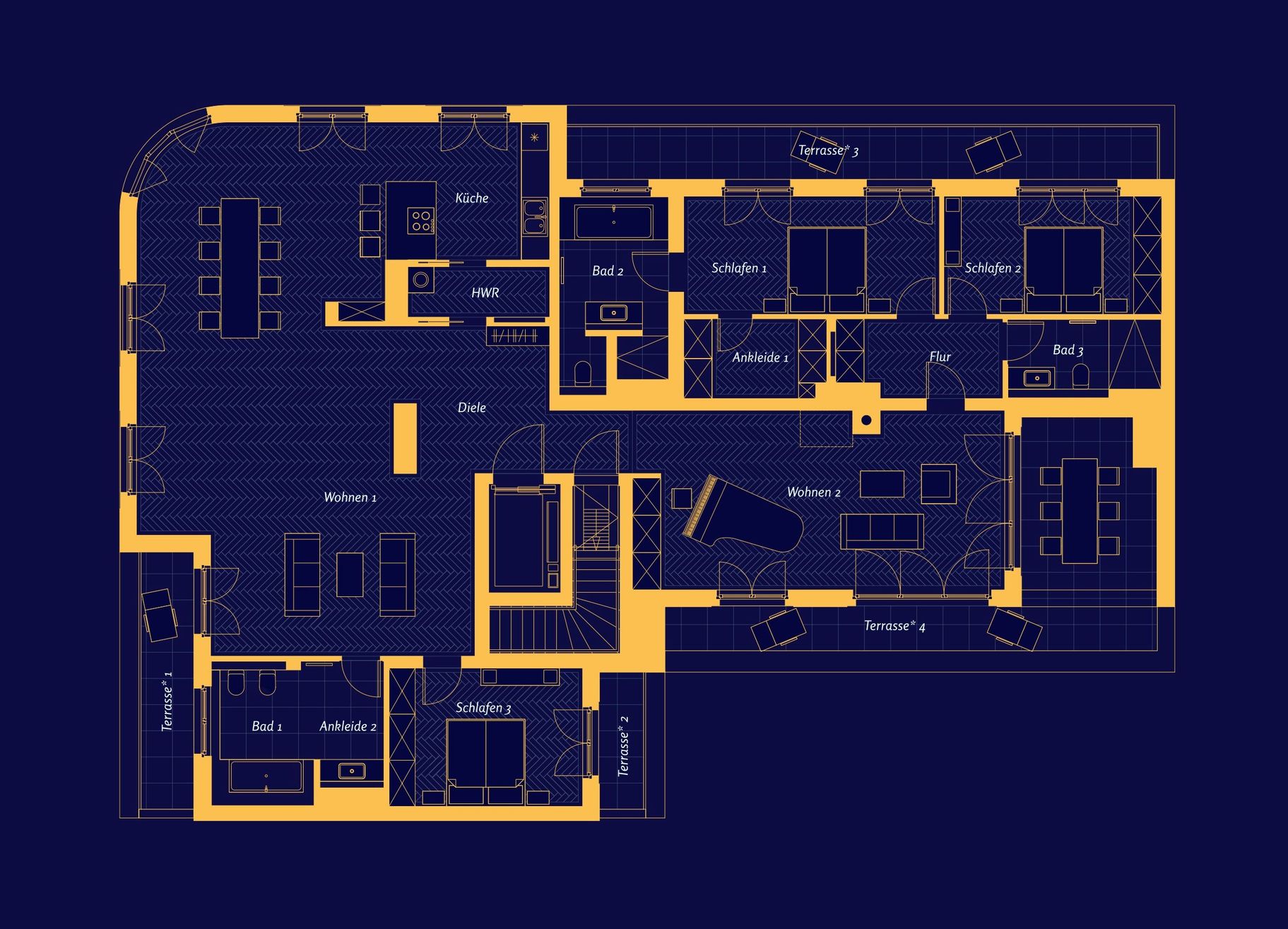 Natural wood parquet floors with a frieze throughout, exquisite large-format tiles and stylish fittings create an exclusive ambiance that meets the highest standards. The profiled doors with matching profiled door frames flowing into matching baseboards are a nod to the time this popular area was built.